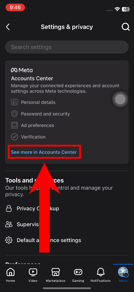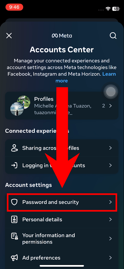 - Tap on Accounts Center.