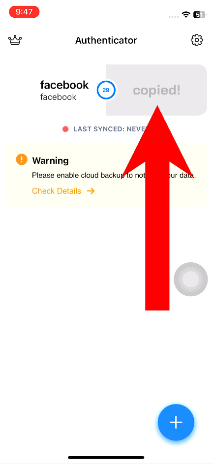 - Copy the authentication code for your Facebook account in the Authenticator App.
