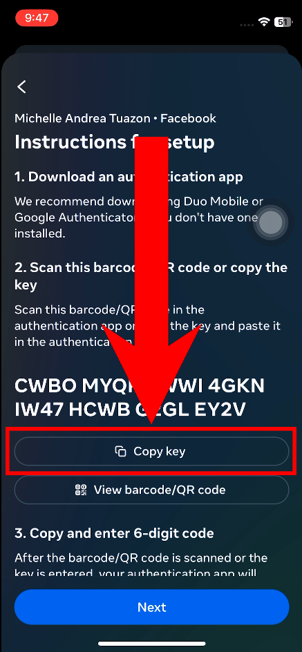 - On the next page, you’ll see a key that you need to use to register your Facebook account to the authenticator. Tap on Copy Key.